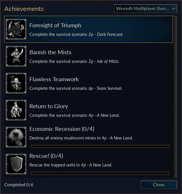 Wesnoth now has built-in support for achievements! These achievements are not Steam achievements, however because of that they are not limited to a pre-defined set of achievements available only to the base game — add-ons can define their own achievements and can even add additional achievements to other add-ons or to mainline. For this initial version, achievements are already implemented for the tutorial campaign, Descent into Darkness, Eastern Invasion, Liberty, and the co-op multiplayer maps Dark Forecast, Isle of Mists, A New Land and Team Survival.